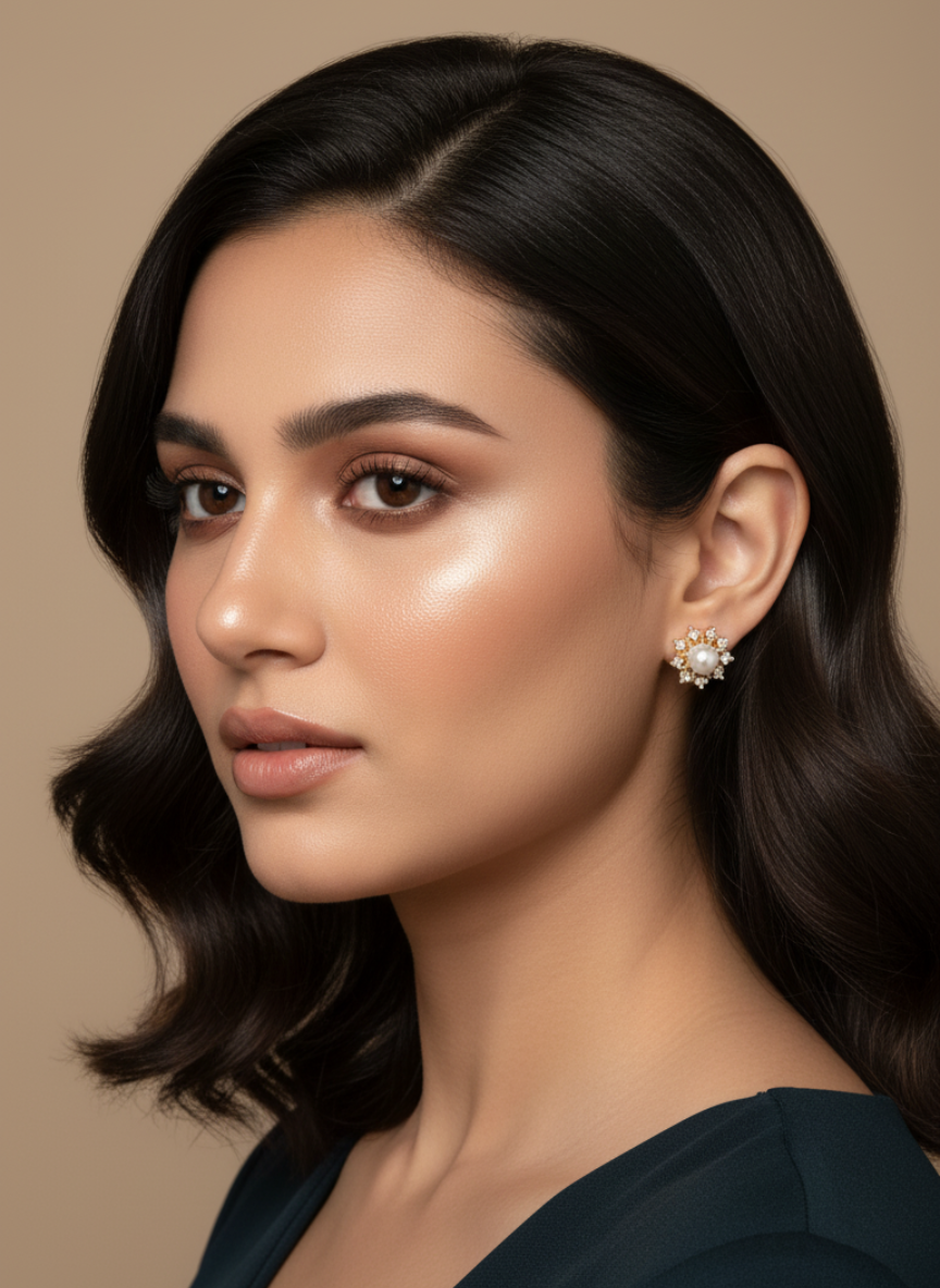 Let the Celestial Pearl Halo studs elevate your jewelry collection—where radiant shimmer meets classic beauty.