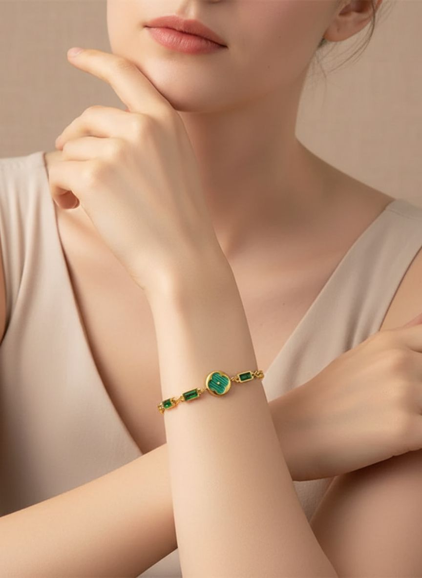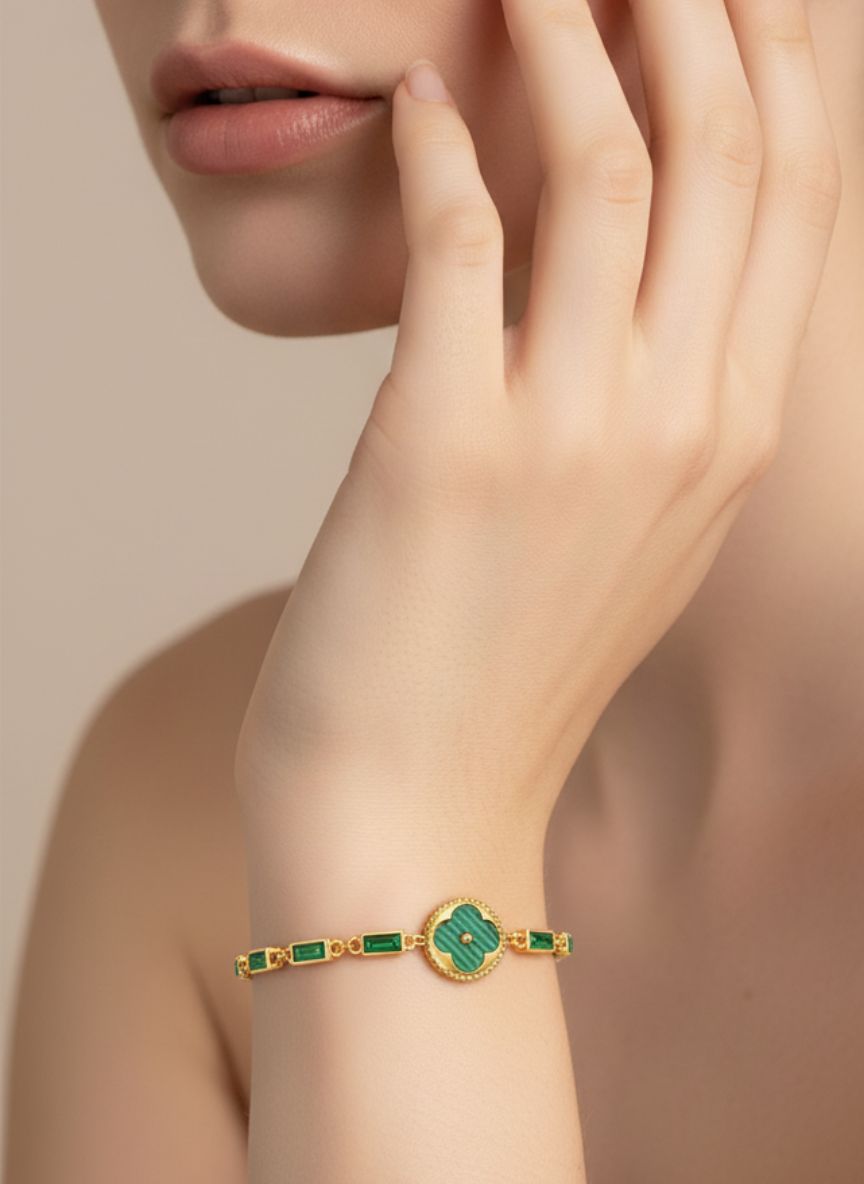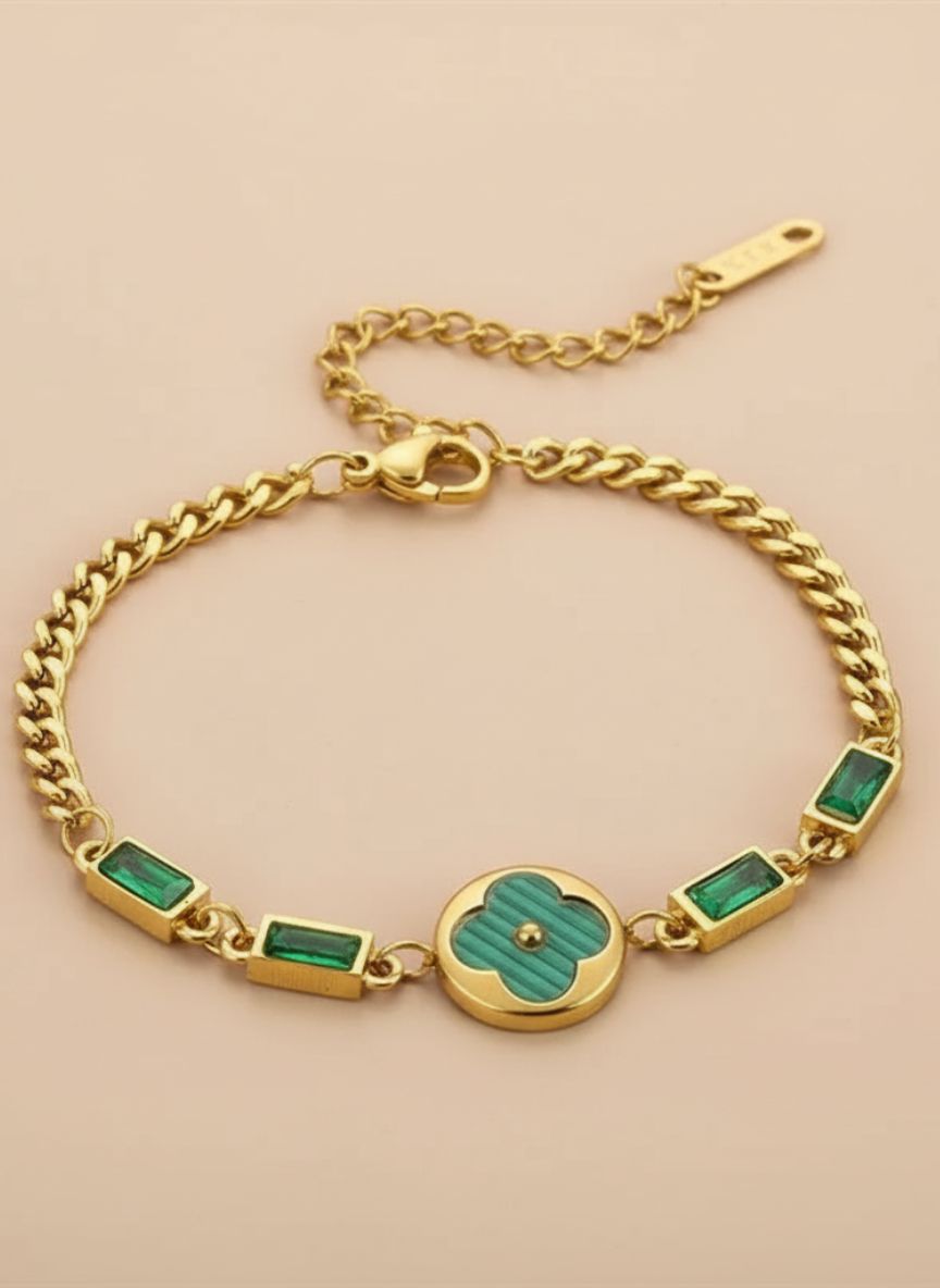 Turn heads with the Emerald Clover Baguette Bracelet—sleek gold links set with vivid green baguette stones and a glossy clover medallion that brings modern color and instant sophistication.