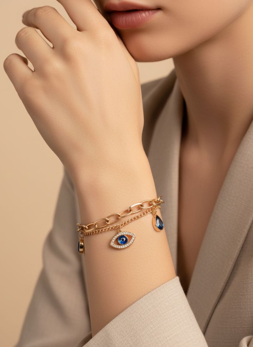 - Design: Layered silhouette with adjustable clasp, adorned with evil eye, teardrop, and gold disk charms