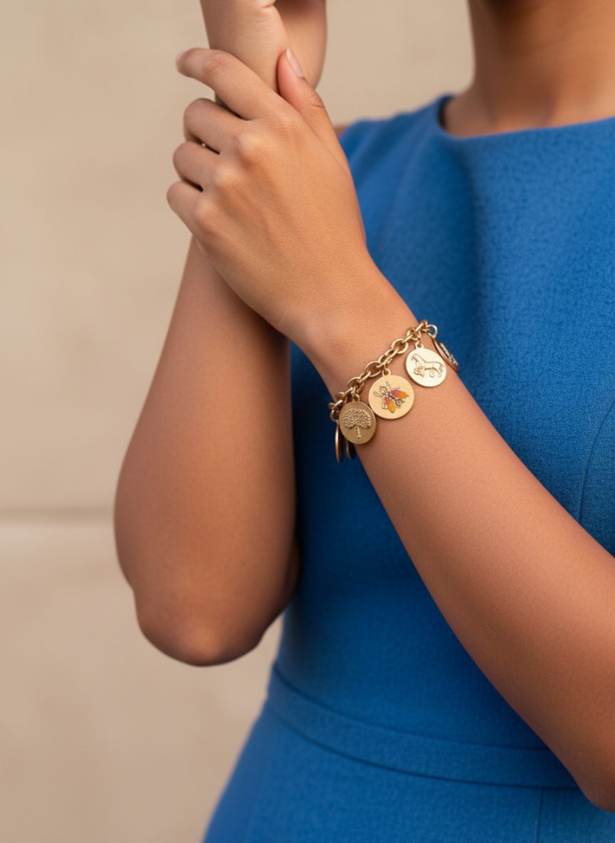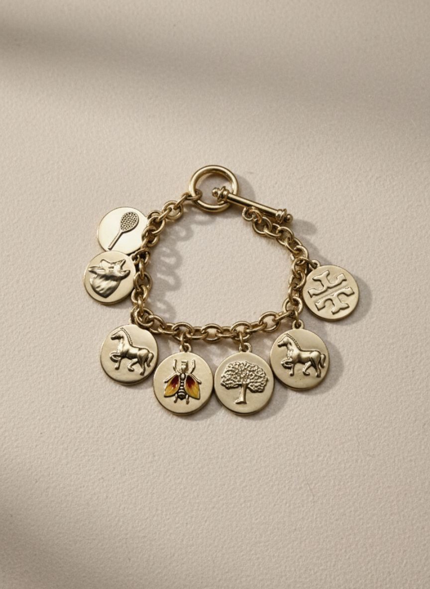 Tell your story in gold with the Golden Heritage Medallion Bracelet—featuring a classic cable chain strung with embossed coin charms, including a horse, tree, tennis racket, crest, and a hand‑painted beetle, finished with a polished toggle clasp for effortless elegance.