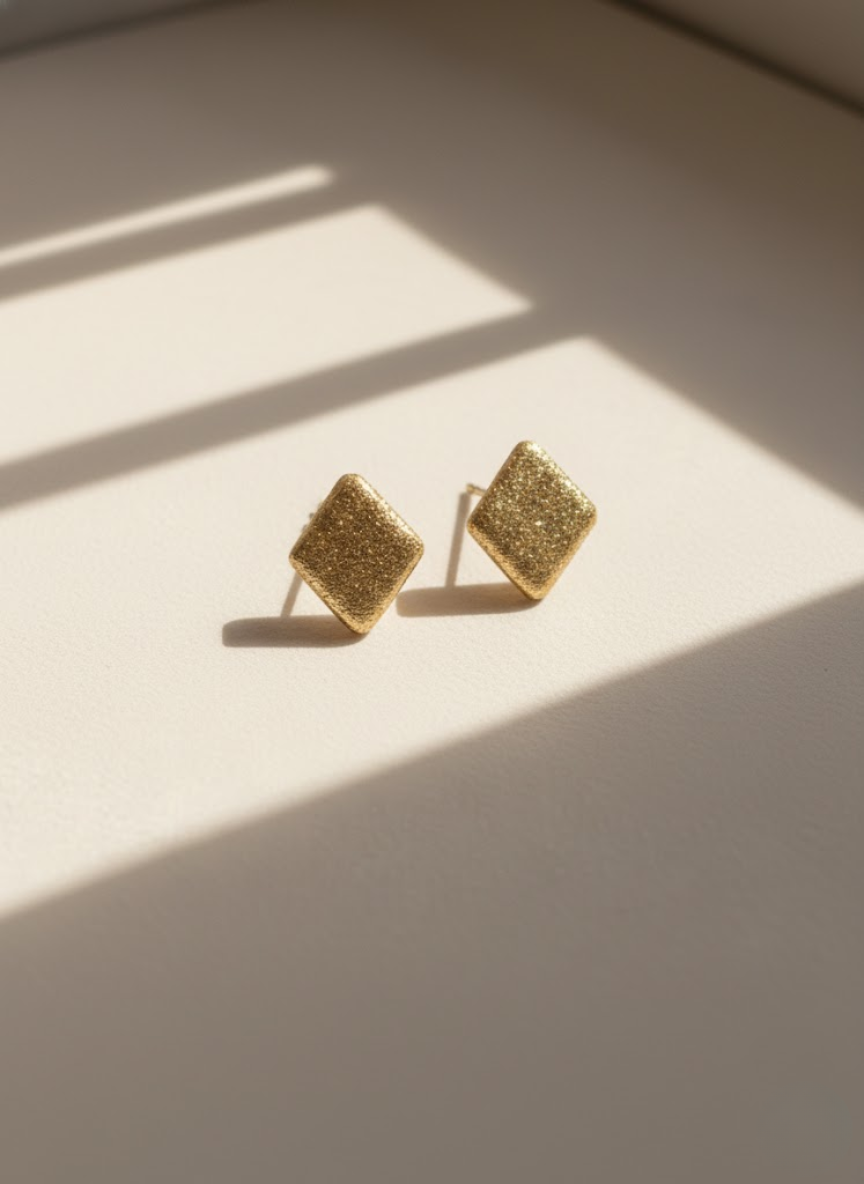 Make a bold impression with the Golden Prism Textured Stud Earrings—striking square profiles featuring a glittering, textured gold surface for radiant impact and contemporary glamour.