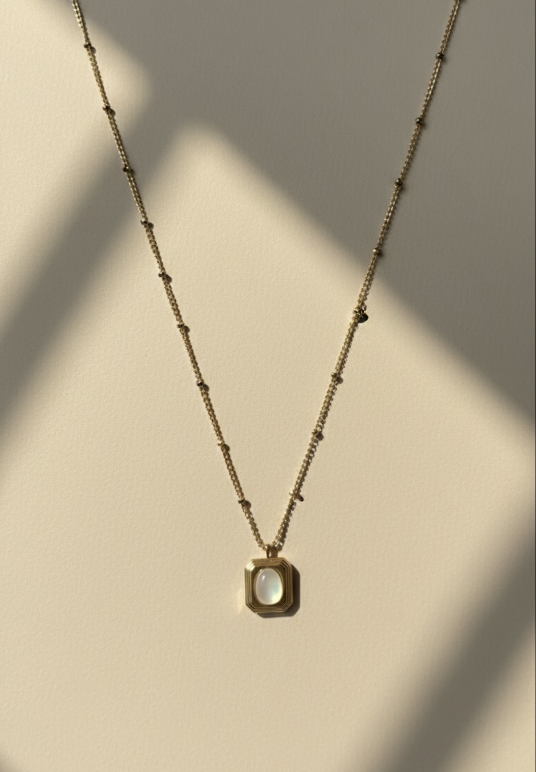 Glow with understated elegance in the Halo Mother‑of‑Pearl Pendant—an oval white center framed by sculptural gold layers, suspended from a delicate chain for everyday luminous charm.