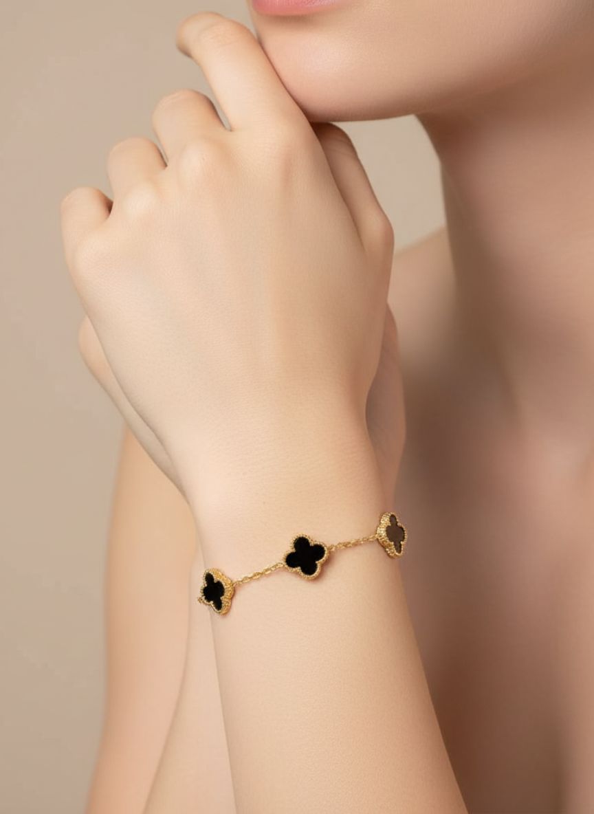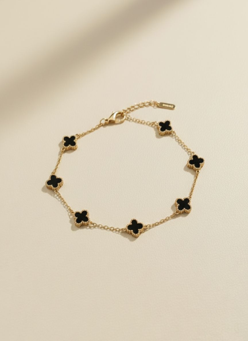 Sleek and striking, the Midnight Clover Station Bracelet features glossy black enamel clovers framed in beaded gold, spaced along a fine chain for minimal, high‑contrast elegance.