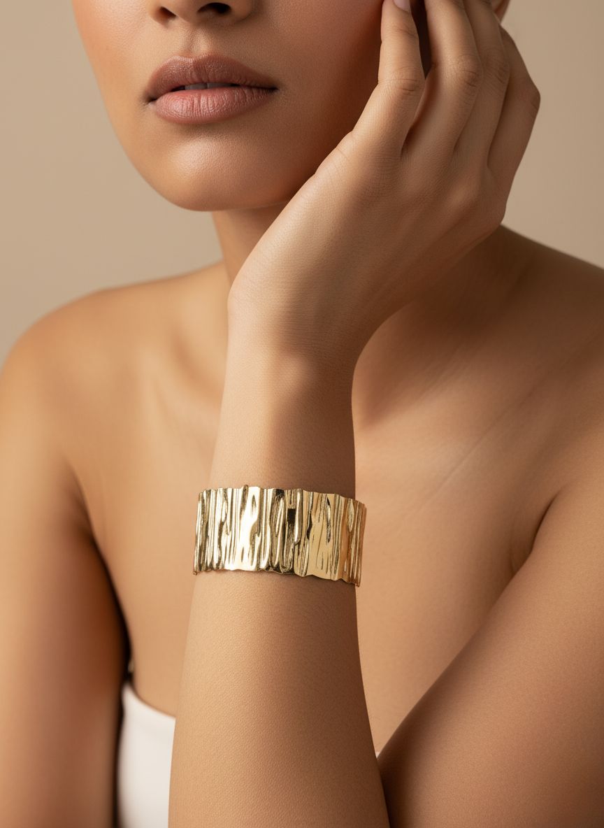 Make a striking statement with the Molten Wave Cuff Bracelet—sculpted in gleaming gold with fluid, rippled texture that catches the light from every angle for bold, gallery‑worthy elegance.