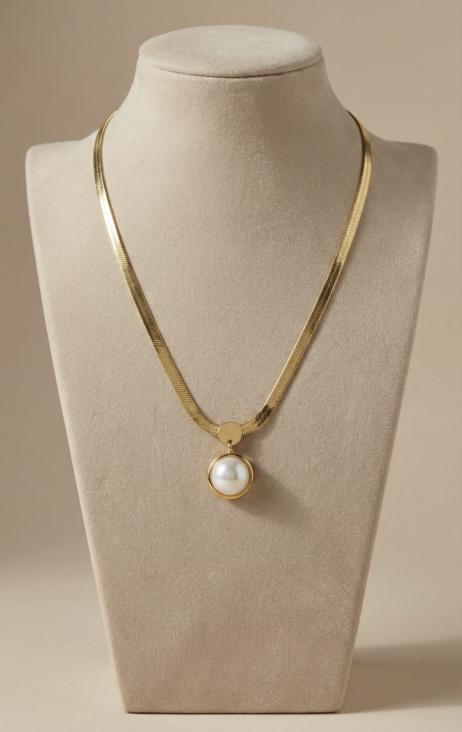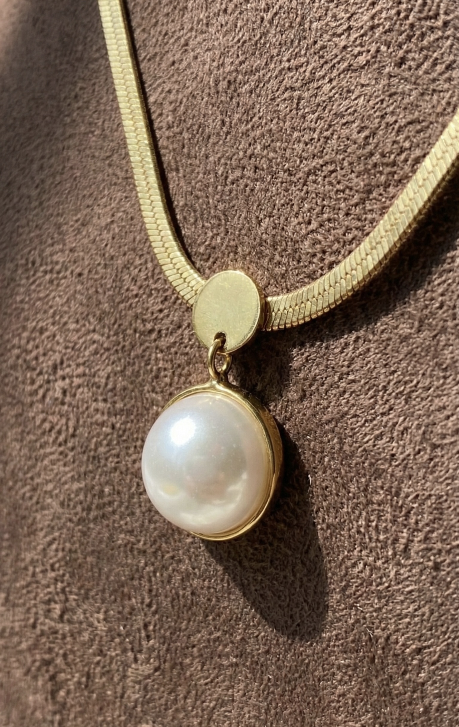 Make every outfit feel refined with the Pearl Golden Heirloom Necklace — a smooth gold chain finished with a luminous pearl pendant, framed in a sleek bezel for timeless, everyday elegance.