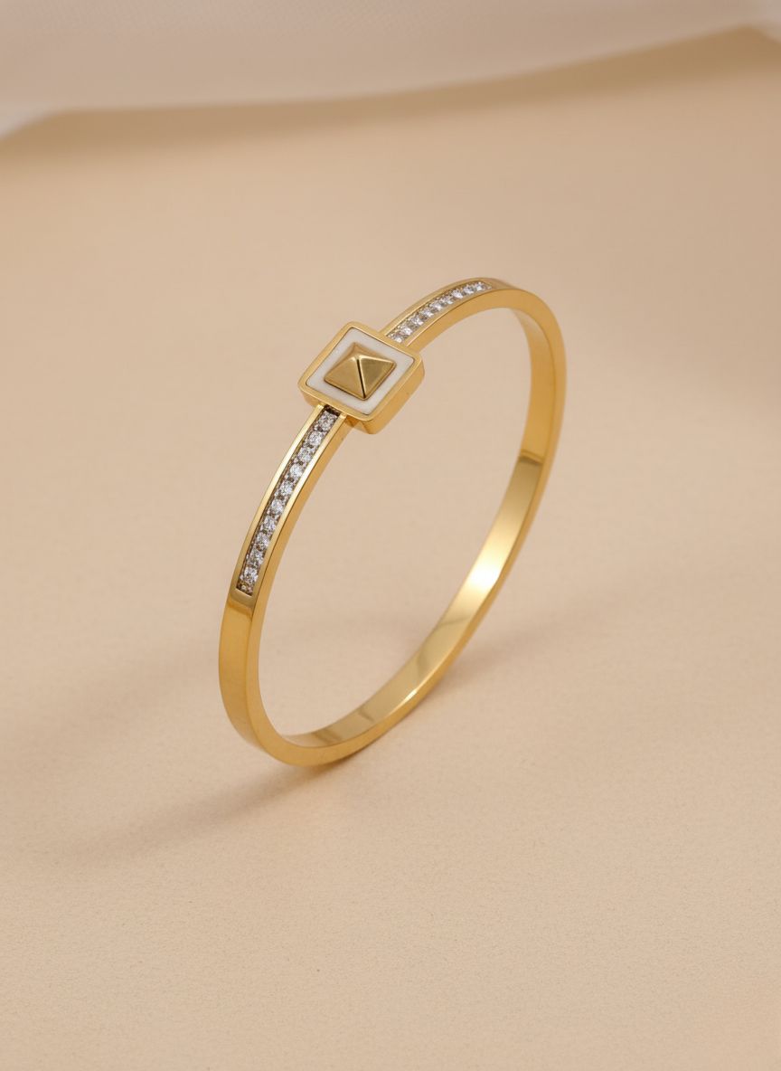 Elevate your wrist stack with the Pyramid Enamel & Pavé Accents Bangle—a modern, gold-toned bangle featuring a row of sparkling pavé-set crystals and a striking pyramid center framed by glossy white enamel for sophisticated contrast.