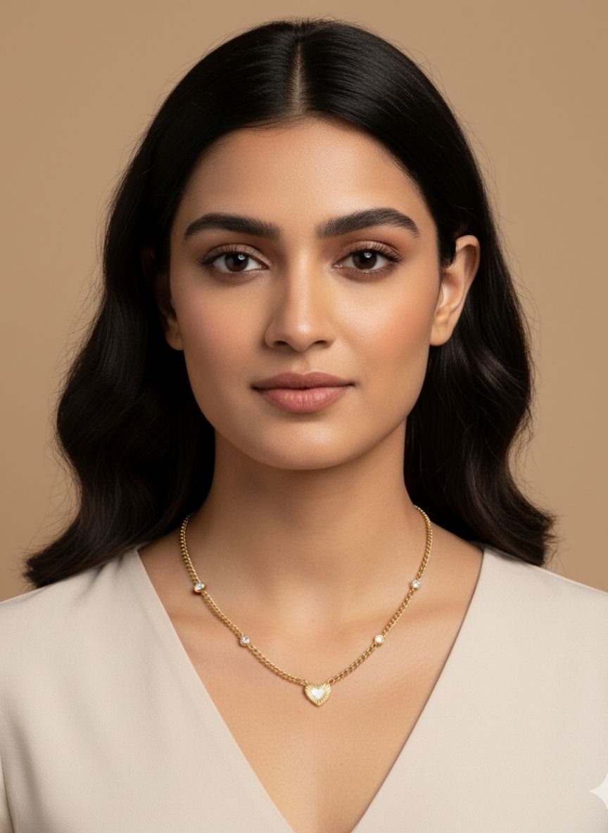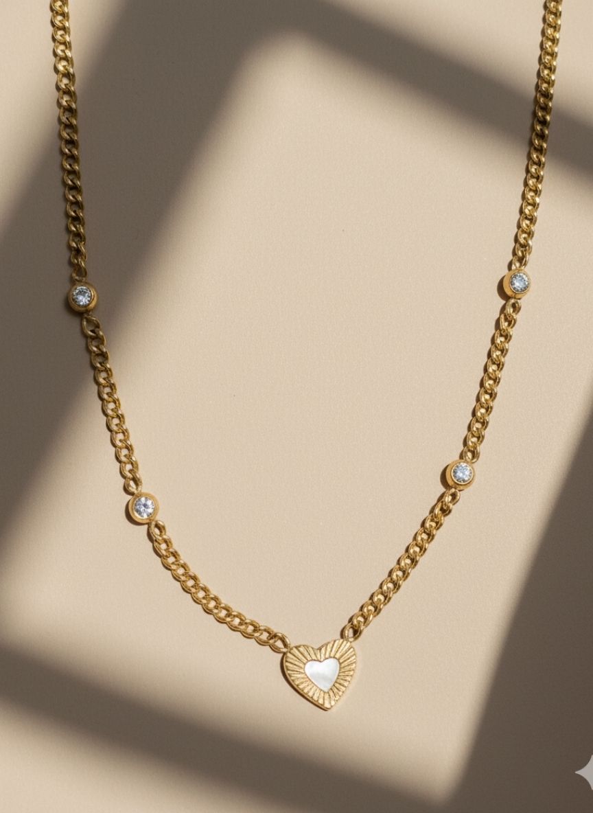 Meet your new everyday favorite: the Radiant Heart Chain Necklace—a chic gold curb chain punctuated with bezel‑set crystals and finished with a mini heart medallion accented by a luminous mother‑of‑pearl center.