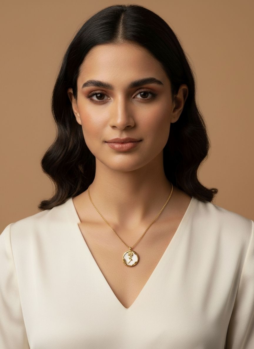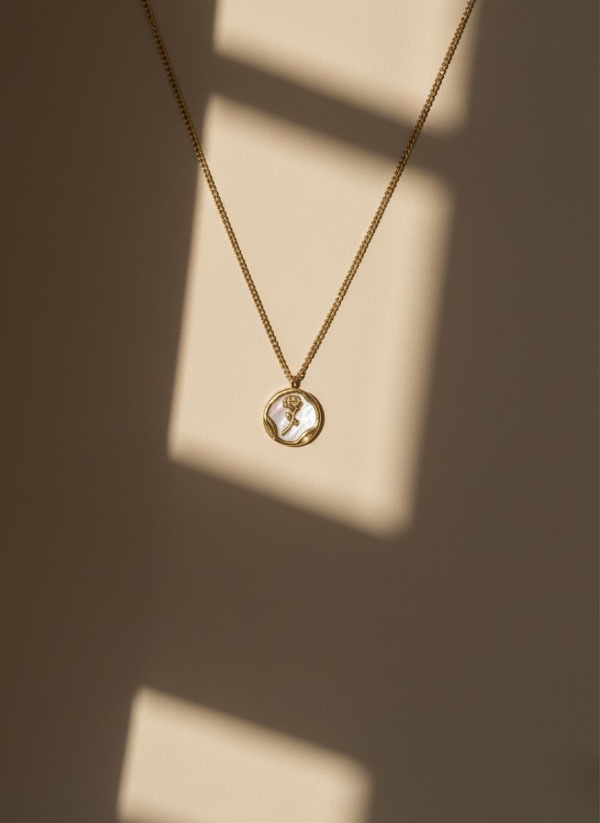 Vintage‑inspired and luminous, the Rose Cameo Medallion Necklace features a round mother‑of‑pearl disc framed in molten‑style gold with a delicate raised rose—capturing soft shine and timeless romance.