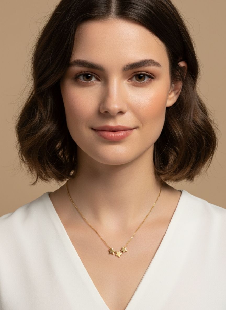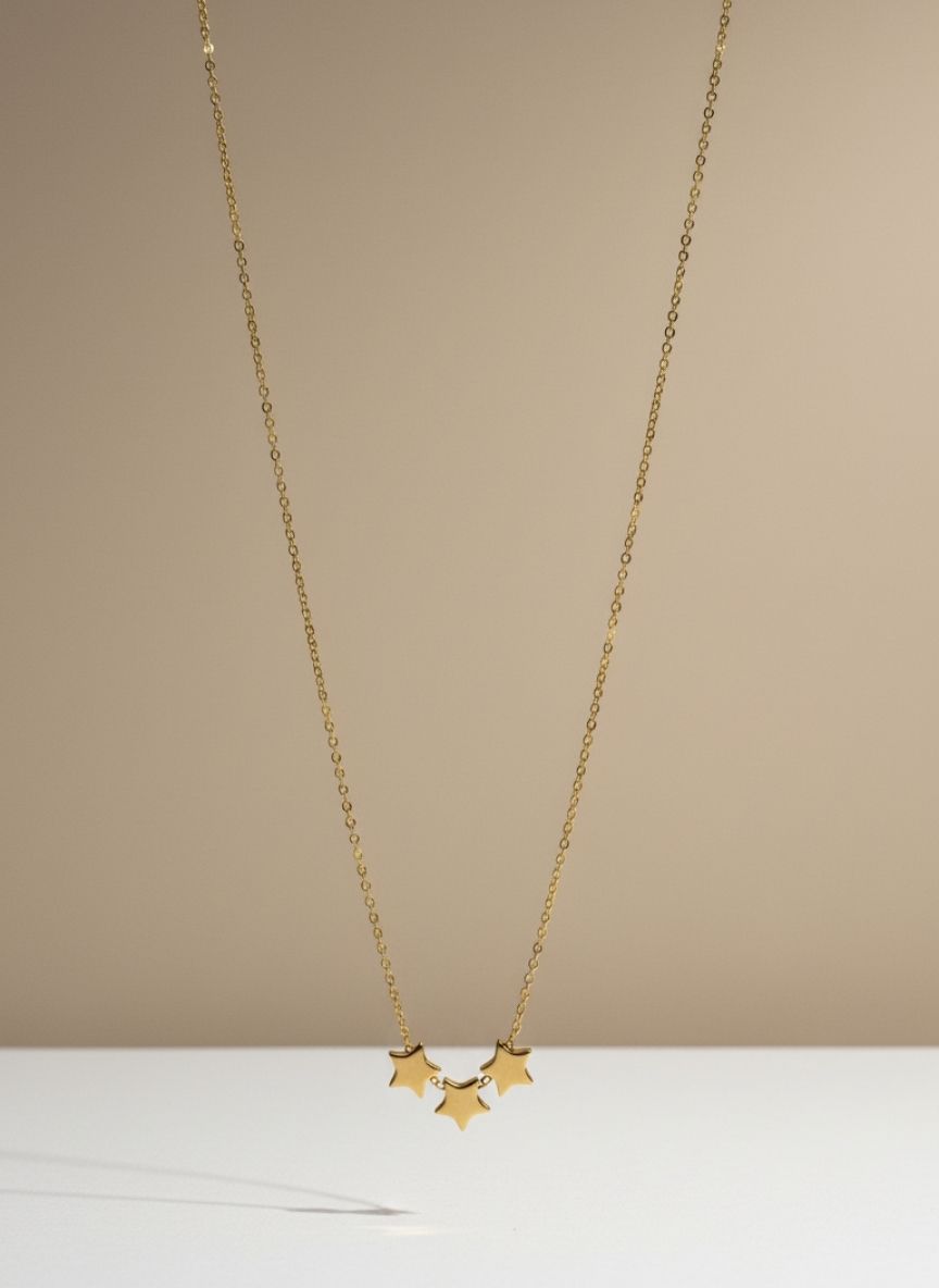 Shine subtly with the Starlit Trio Pendant Necklace—three petite gold stars suspended in a graceful arc on a delicate chain, adding celestial charm to everyday looks.