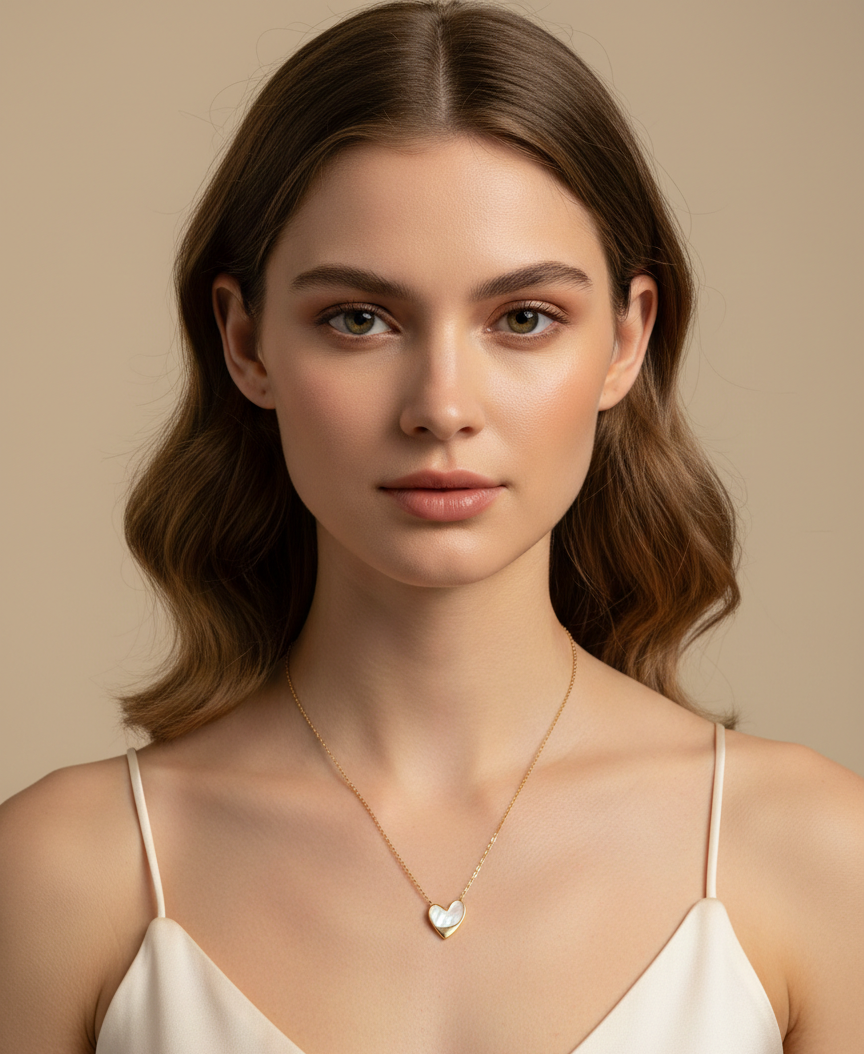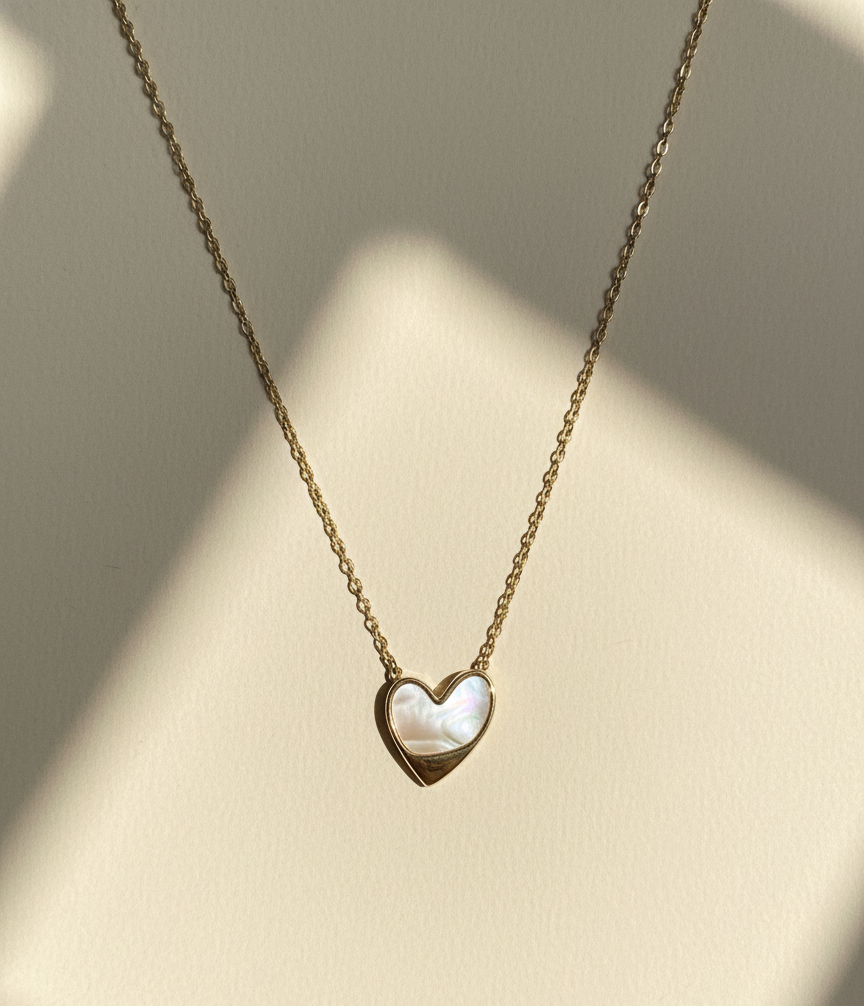 Embrace a touch of timeless romance with the Luminous Heart Pendant Necklace—featuring a shimmering mother-of-pearl heart set in a sleek gold frame for a look of soft, modern elegance.